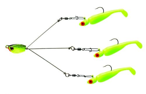 The YUMbrella YUMBTL3 Ultralight Tripod 3 Wire Castable Umbrella Rig allows anglers to throw three lures at once, simulating a small school of baitfish. The YUMbrella YUMBTL3 Ultralight Tripod 3 Wire Castable Umbrella Rig features incredible strength and durability, ensuring the lure arms never break free. Each lure arm is stainless steel that has been repeatedly heat tempered to create a Super Wire unmatched in strength and memory. In addition, the top-quality snaps and swivels ensure flawless performance on big fish.